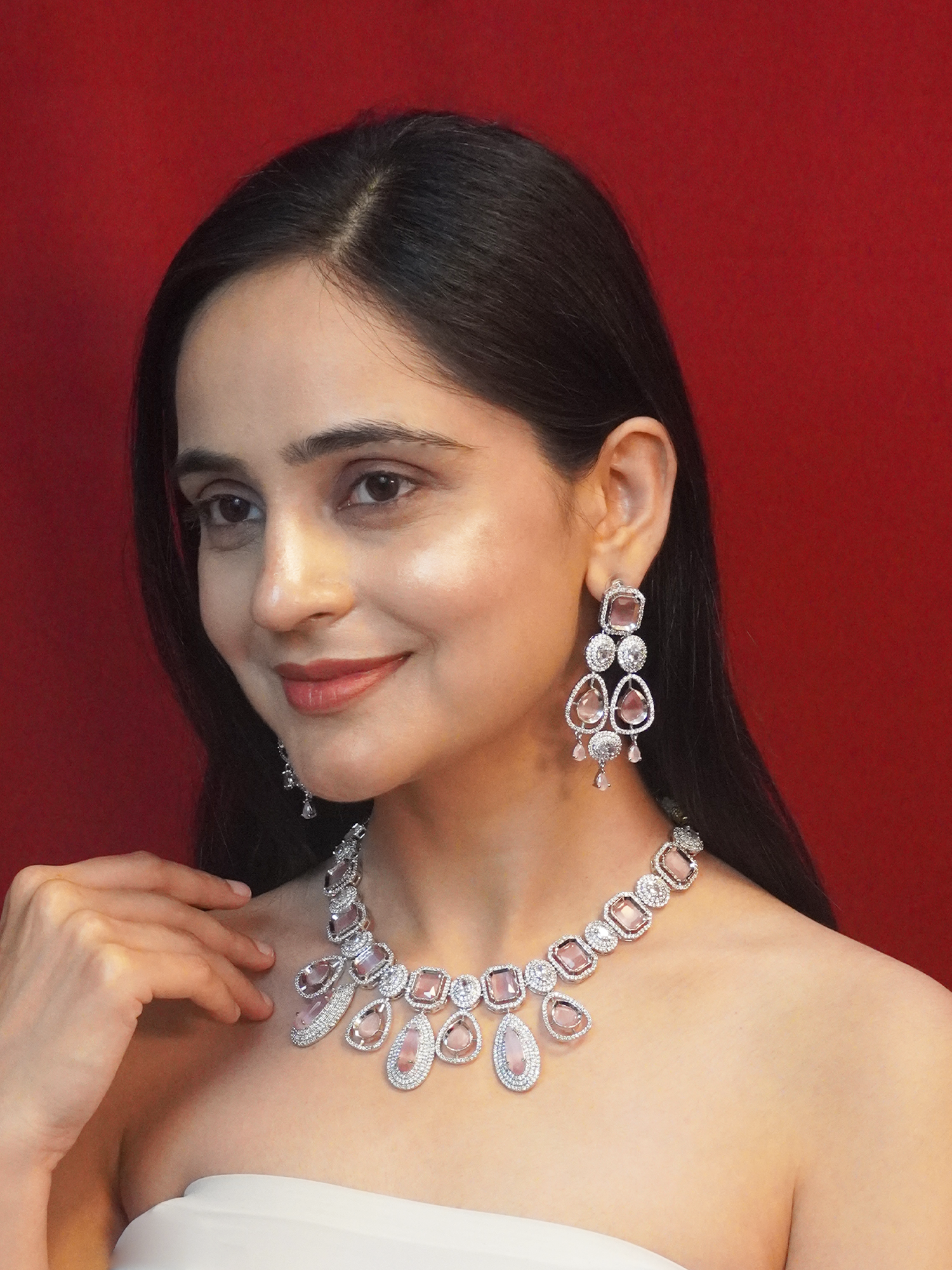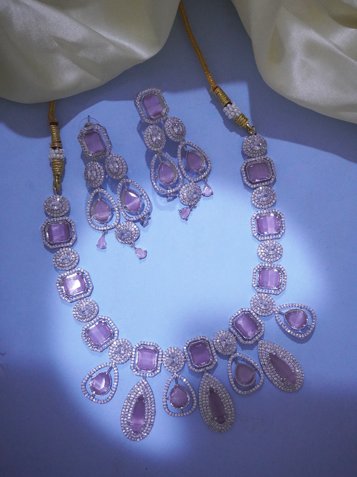 White American Diamond and Mauve Pink Stones Necklace Set with Earrings