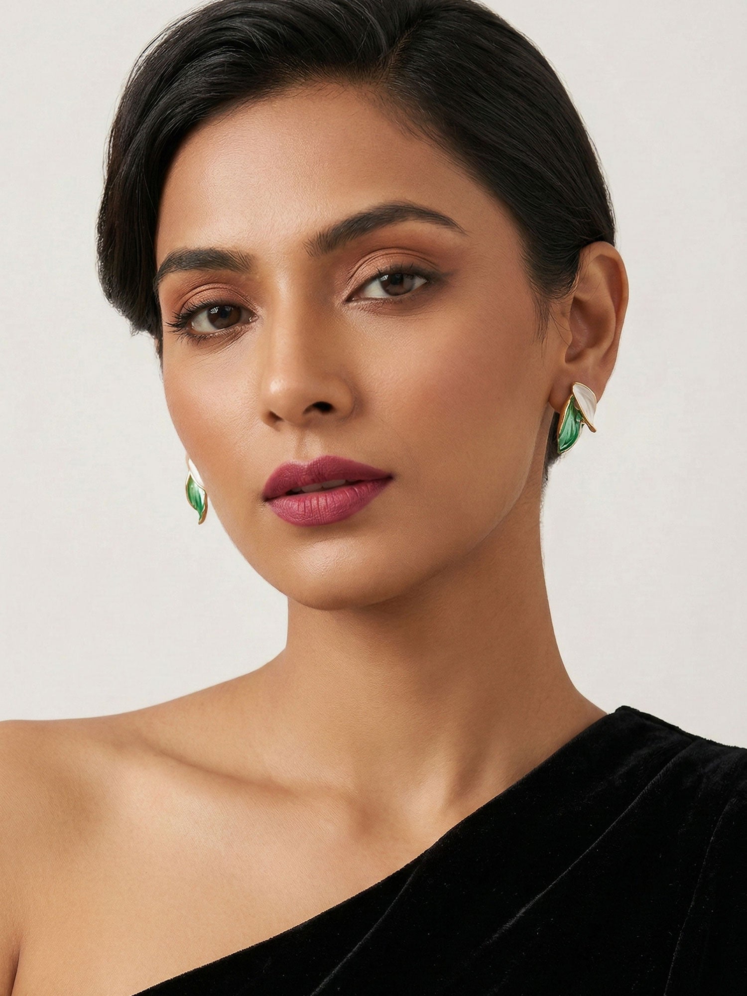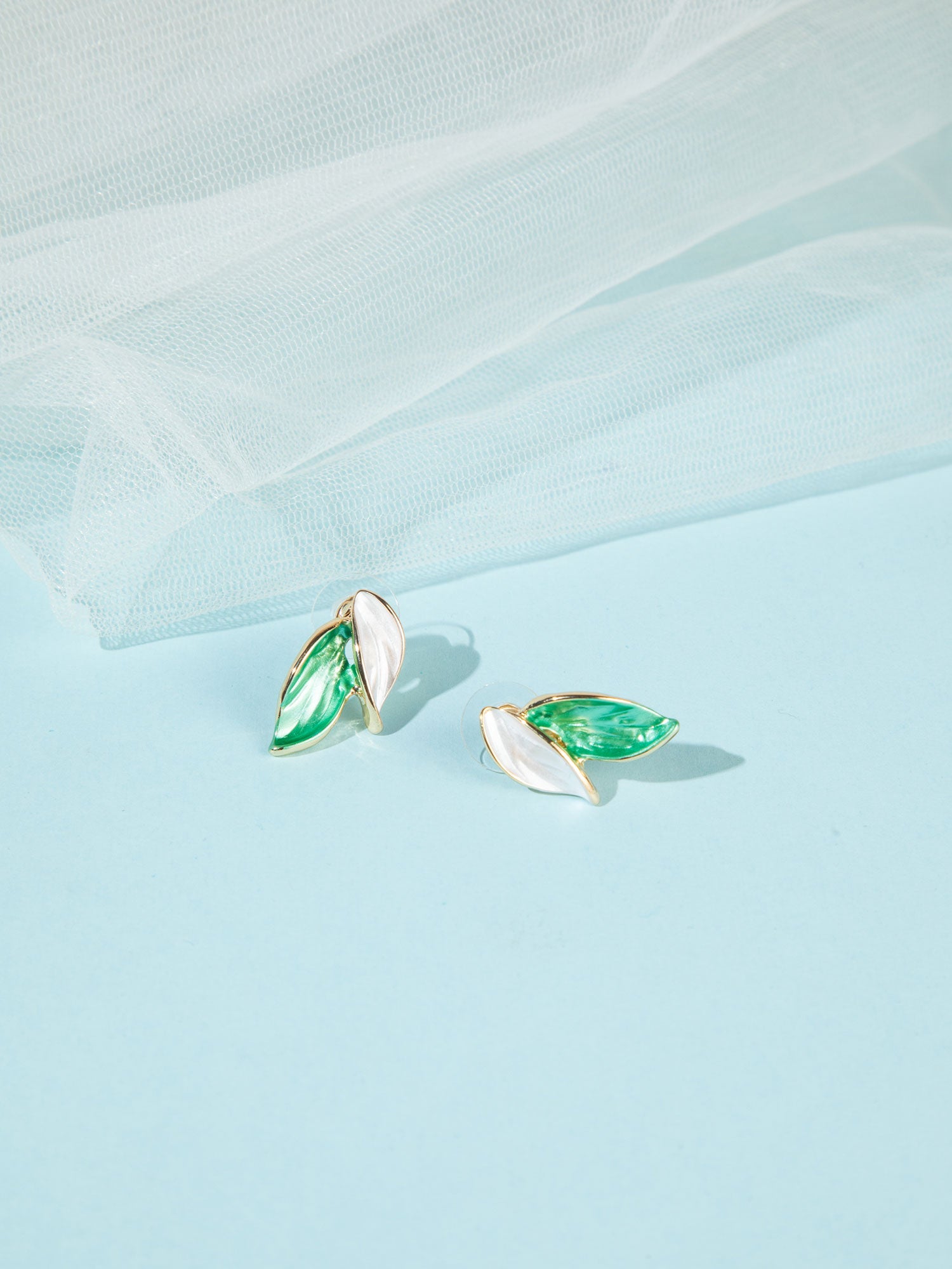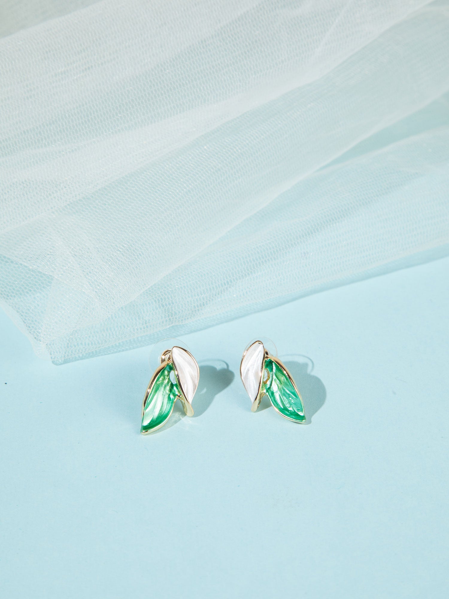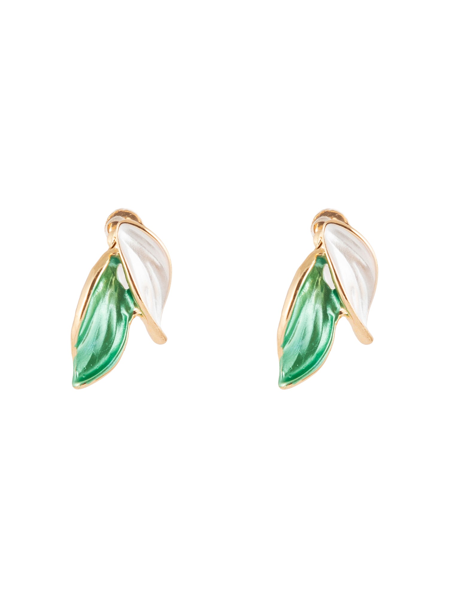 These beautifully designed gold-plated earrings feature a graceful two-leaf motif, adorned with soft white and mint green tones. The delicate color combination adds a fresh and soothing appeal, while the leaf-inspired design brings a touch of nature’s elegance. Lightweight and versatile, these earrings are perfect for both everyday wear and special occasions, offering a refined and modern look.