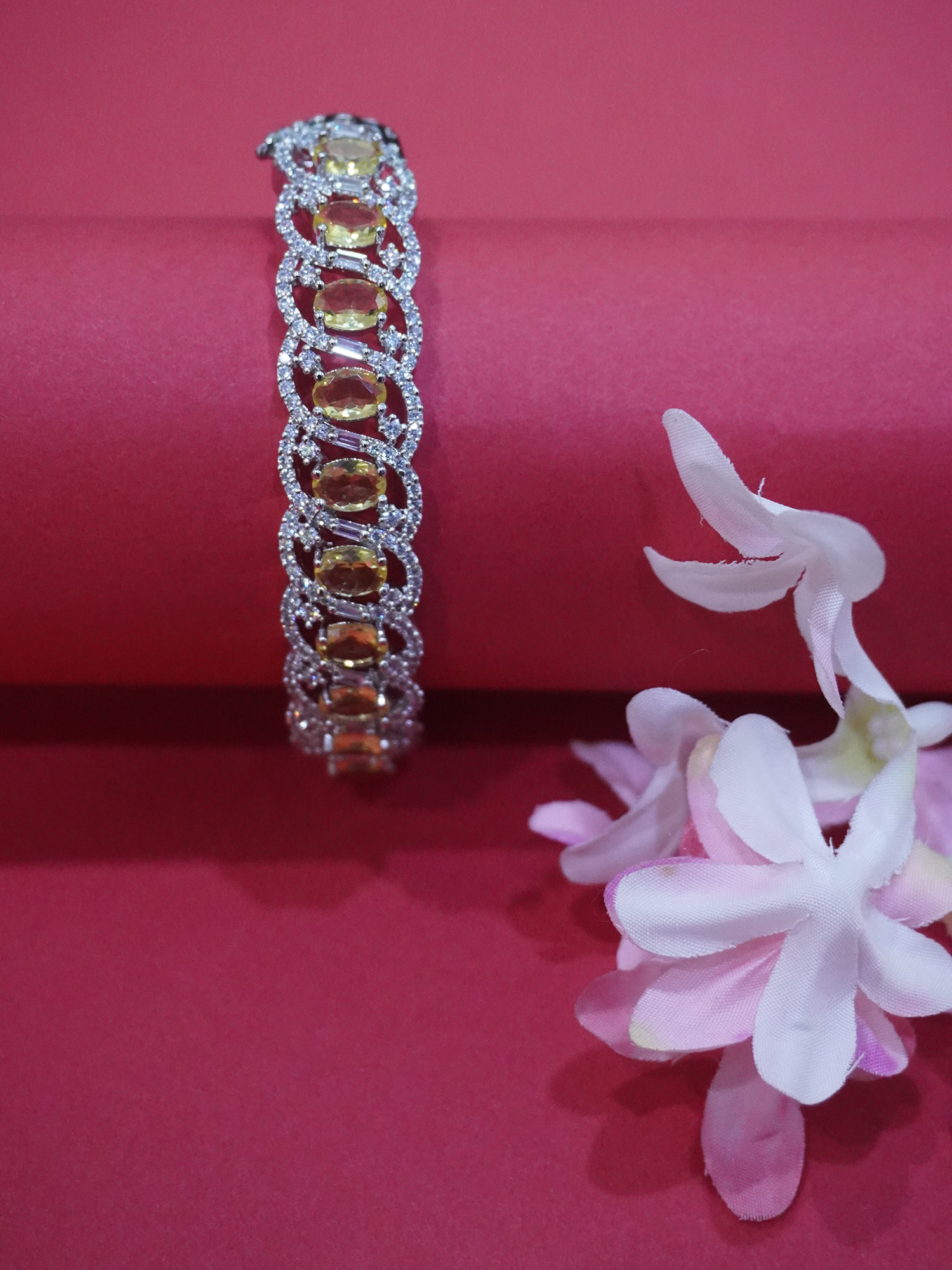 Pair this Yellow and White American Diamond Bracelet with a crisp white blouse and denim jeans for a chic casual look. Add yellow sandals and a statement necklace to complement the bracelet's vibrant hues.